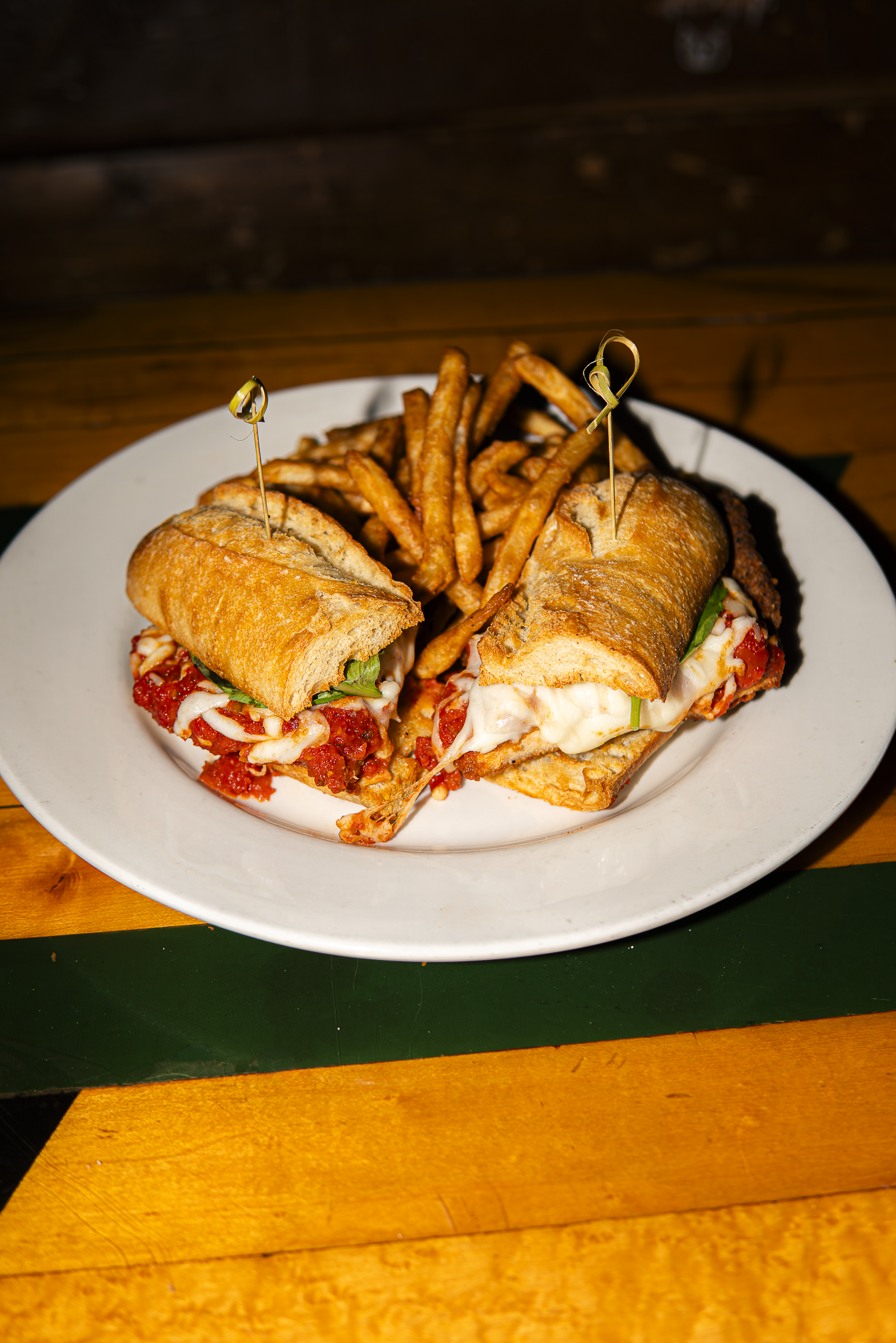 Crispy chicken, marinara sauce, mozzarella and Parmesan cheese, served in a toasted baguette with fries.