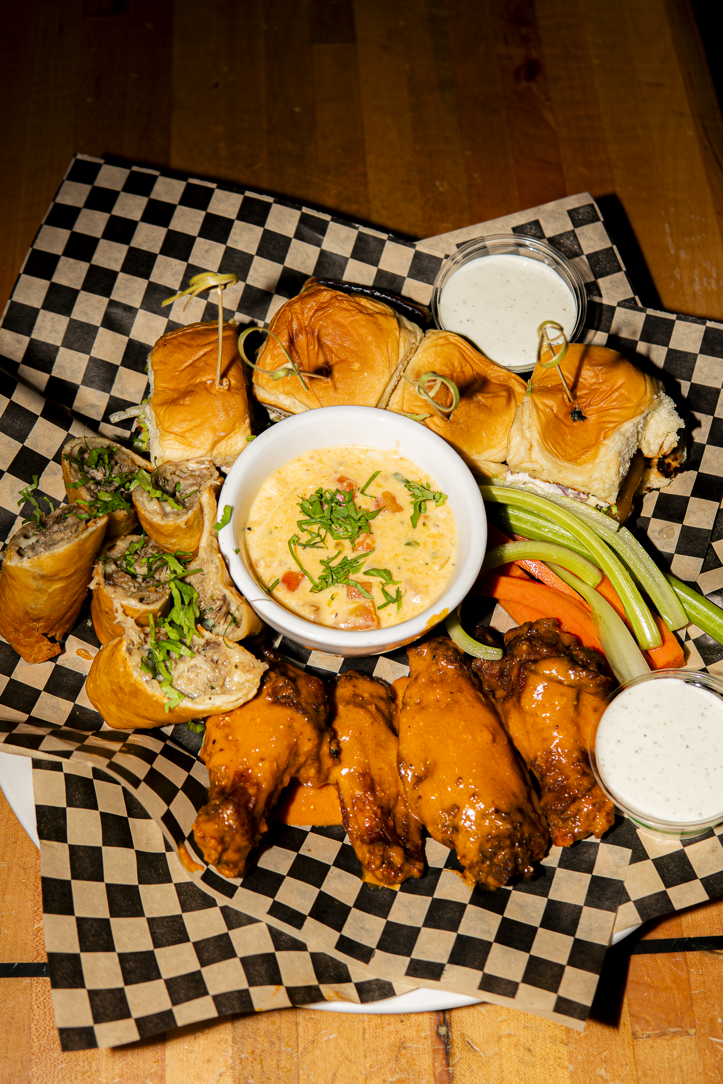 Mini chimis, buffalo wings, burger sliders, cheese sauce, blue cheese, ranch, and wing vegetables.